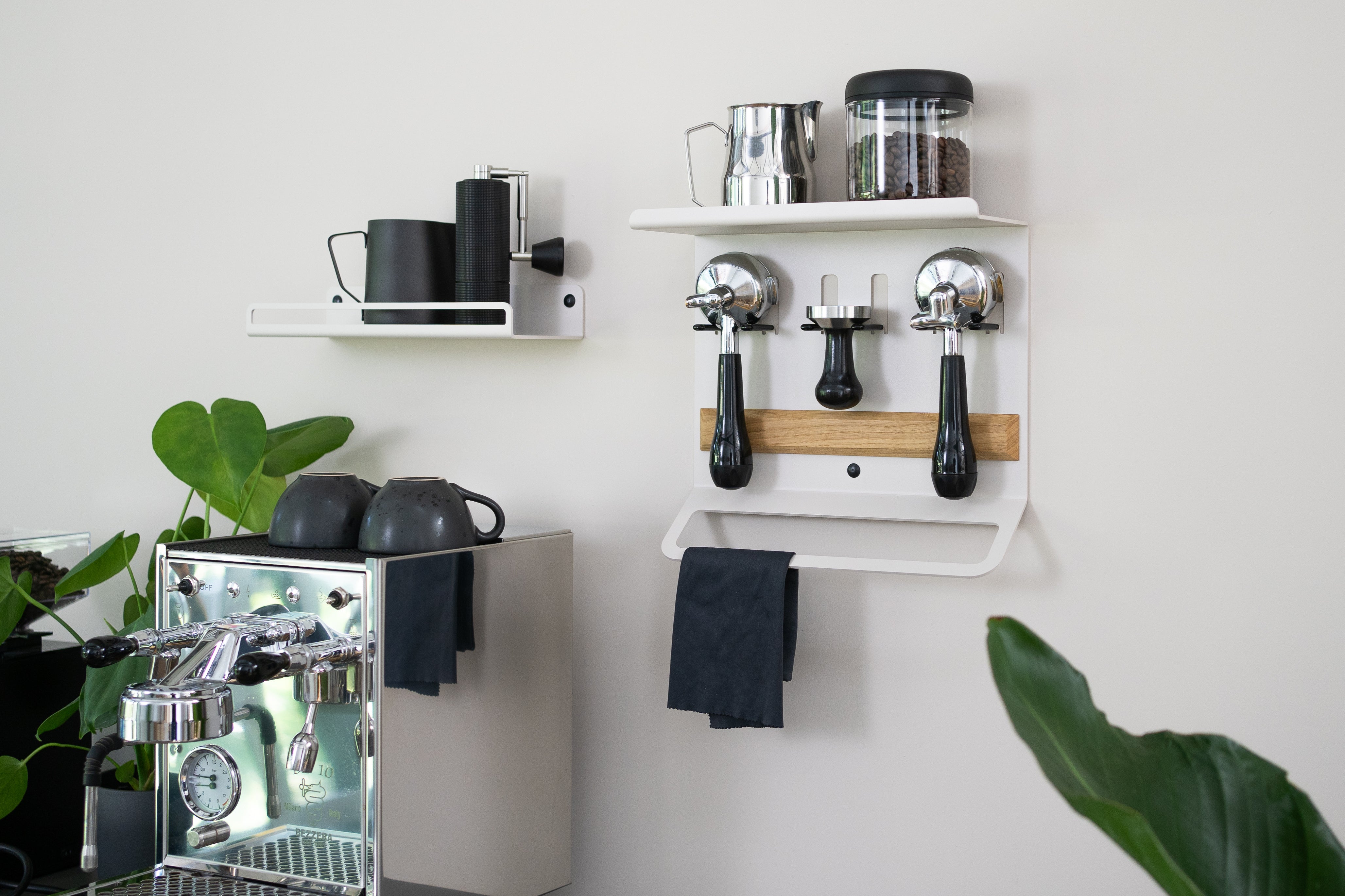 The board can be easily mounted on the wall and is compatible with almost all portafilters of the common models of many manufacturers, such as E61 machines, Sage, De'Longhi, Bezzera, Rocket and many more. The Barista Board can also be perfectly combined with the FLATE® Barista Storage Shelf if you need additional space for coffee beans, storage containers or cups.