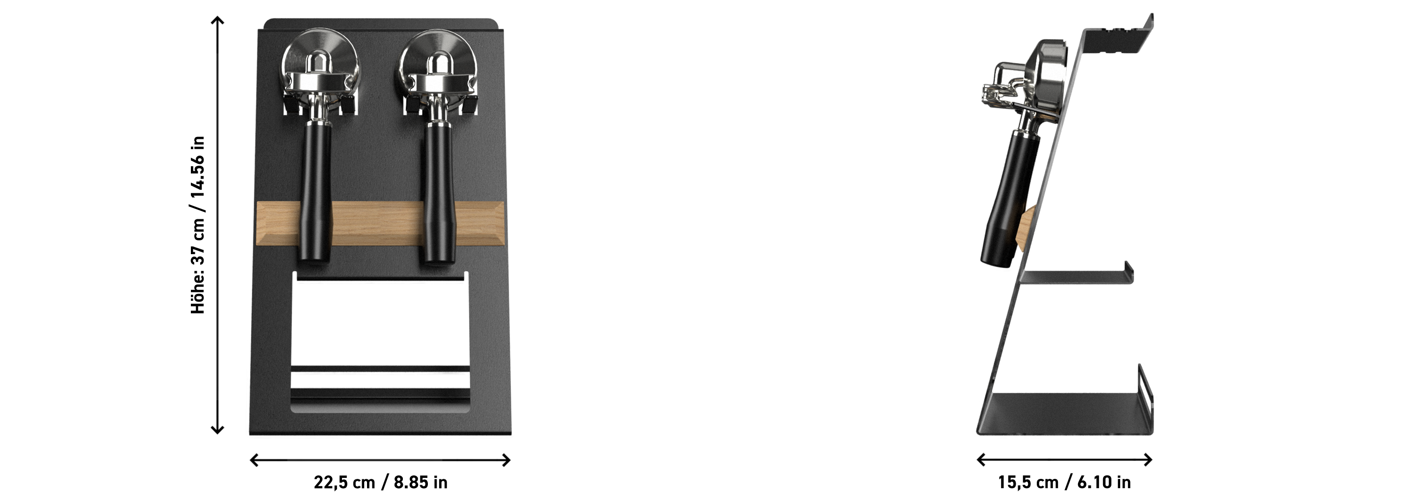 The ideal solution for organizing your coffee corner! Especially for coffee enthusiasts with limited space, it is the perfect companion for your daily coffee routine. This stand is an absolute must-have that sets new standards for organizing your coffee corner and eliminates the need for wall mounting. Our holder is designed to fit all common portafilter models, including E61 machines, Sage, De'Longhi, Bezzera, Rocket, and many more.