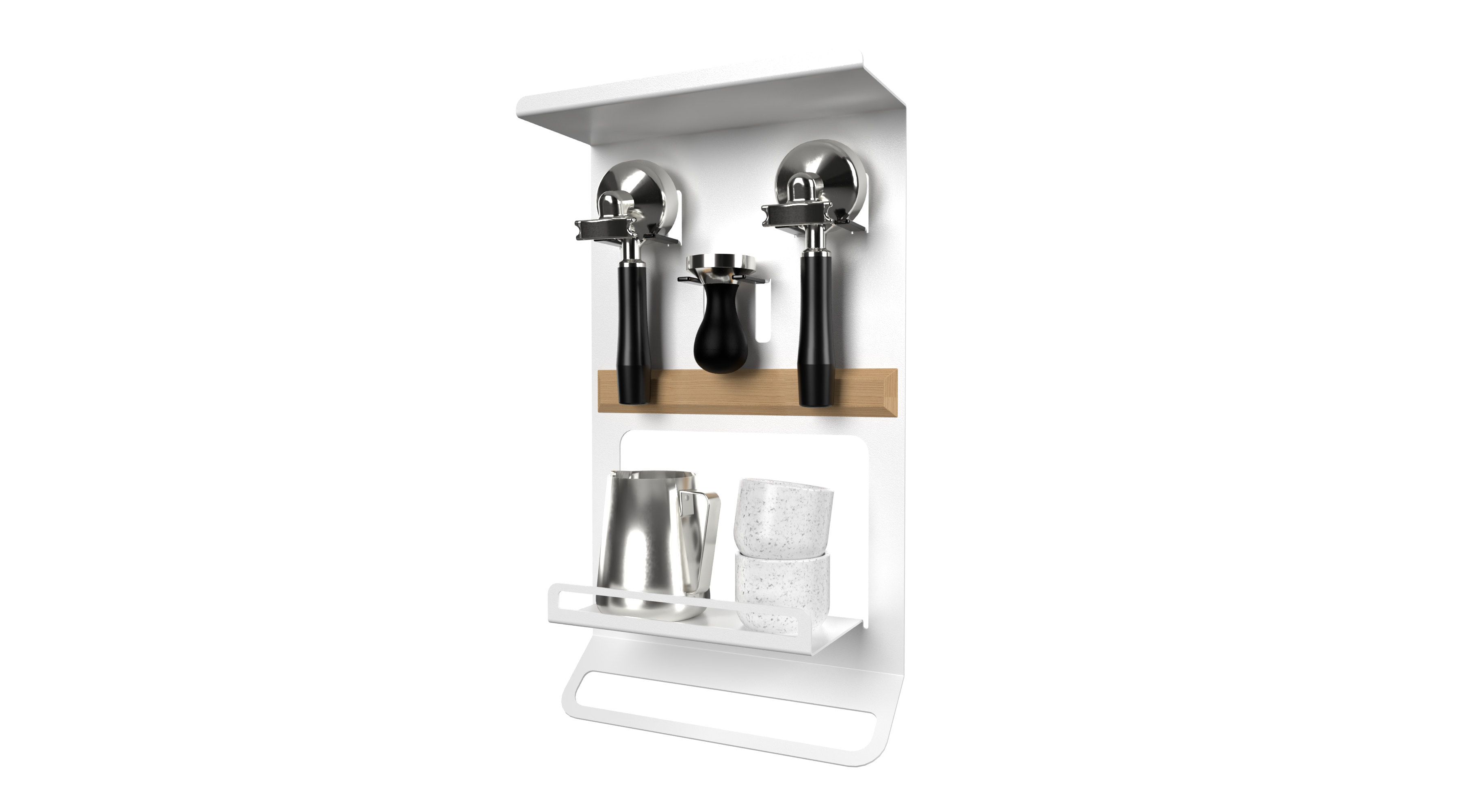Descubra el FLATE® Barista Rack: su estante para portafiltros, tamper y accesorios de café. Este estante de café de alta calidad es el compañero perfecto para su rutina diaria de café, ordena su rincón de café y libera espacio en su superficie de trabajo. Está fabricado en acero con recubrimiento en polvo y se puede montar en la pared. Con tres soportes para portafiltros o tamper, un colgador para paños de barista y dos estantes para otros accesorios, tiene todo lo que necesita para ordenar su rincón del café. Se adapta a todos los modelos de portafiltros estándar, como todas las máquinas E61, Sage, De'Longhi, Bezzera, Rocket y muchas más.