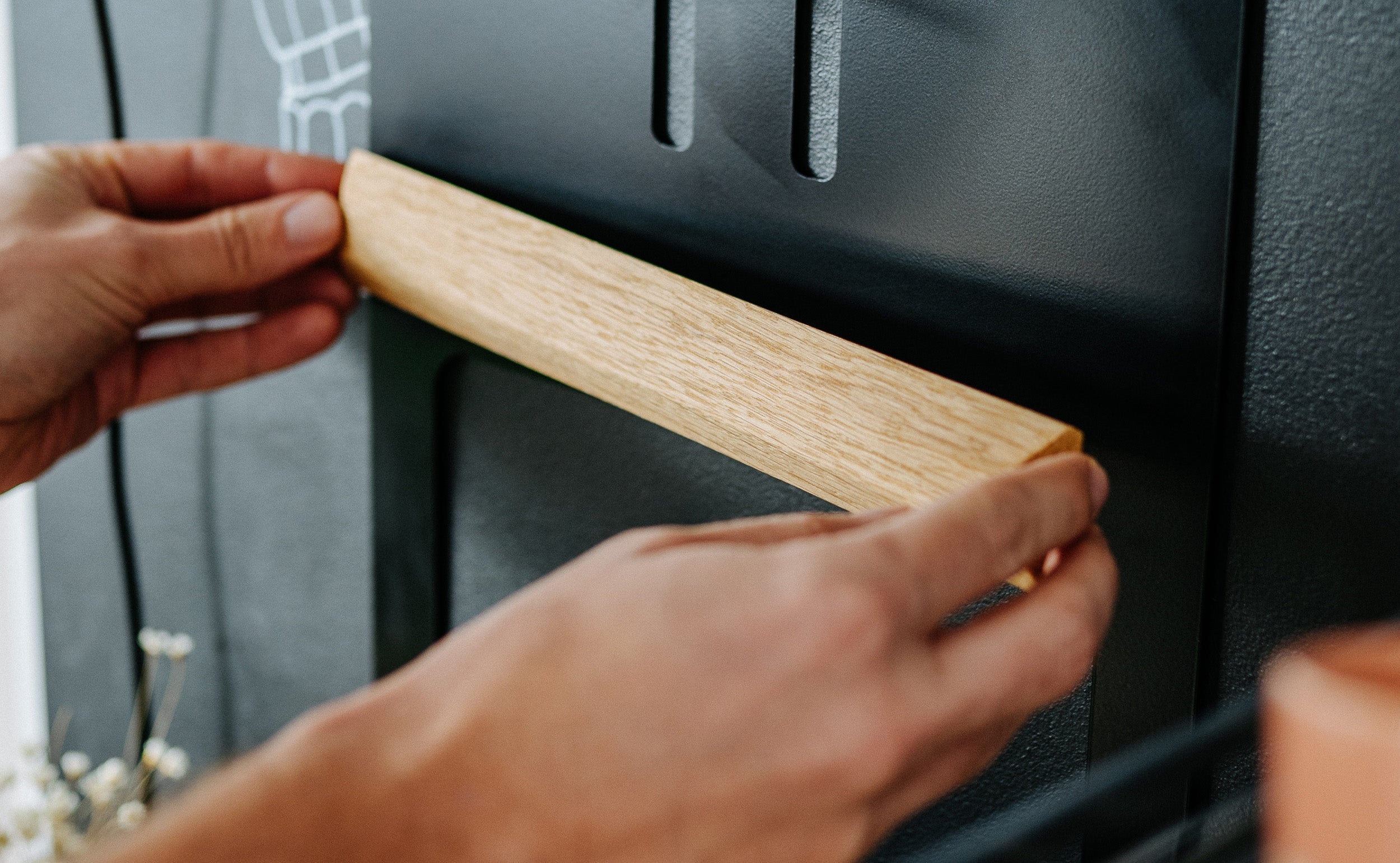 El listón de madera de roble aceitado no sólo tiene un bonito aspecto, sino que también se puede mover de posición gracias a los imanes integrados y sirve así de espaciador perfecto para sus portafiltros.